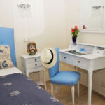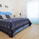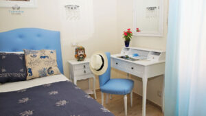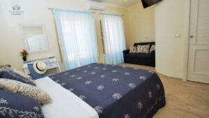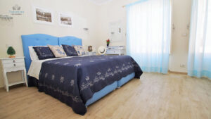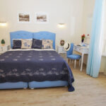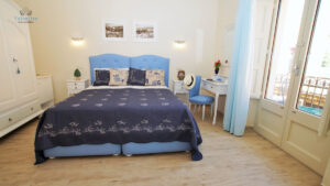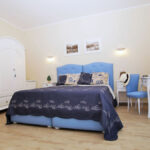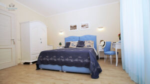 La camera superior Blu Room, si trova al secondo piano dell’edificio ed è arredata in stile classico ed elegante. I mobili sono bianchi, il letto con testata imbottita in stile romantico è realizzato da artigiani locali.