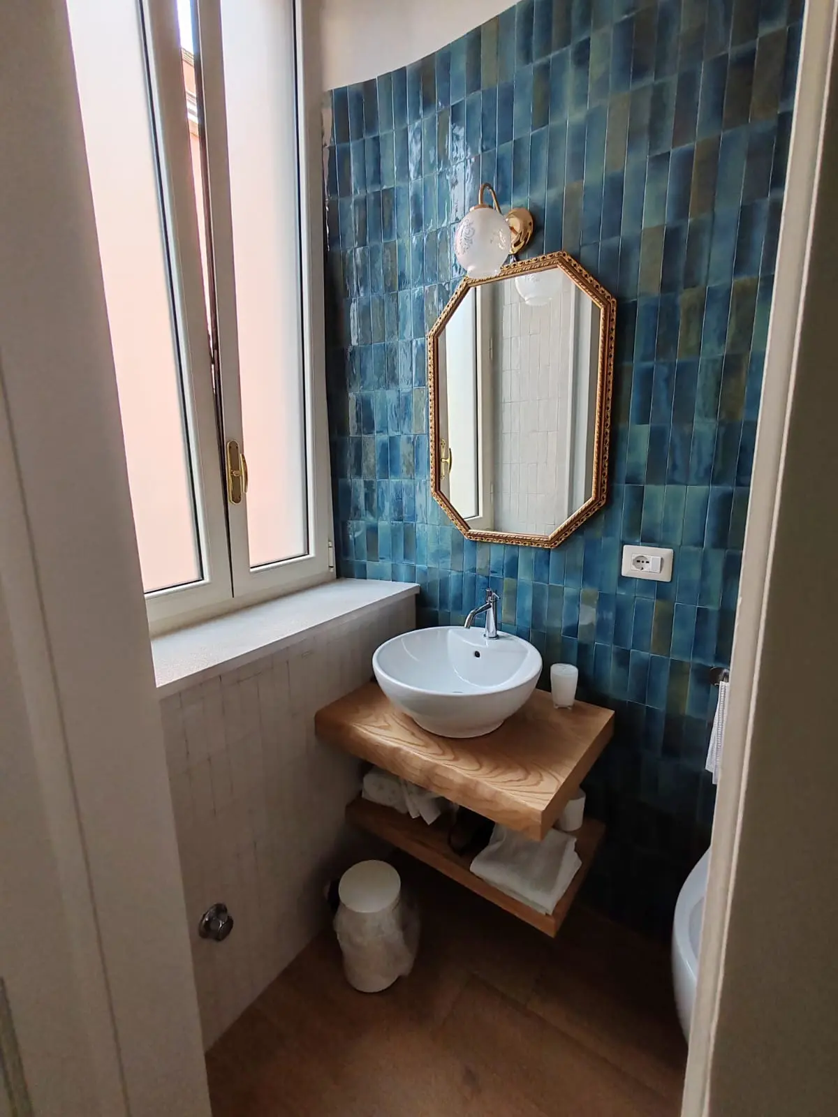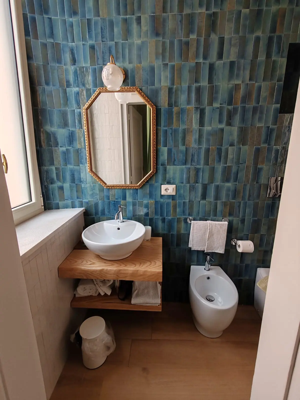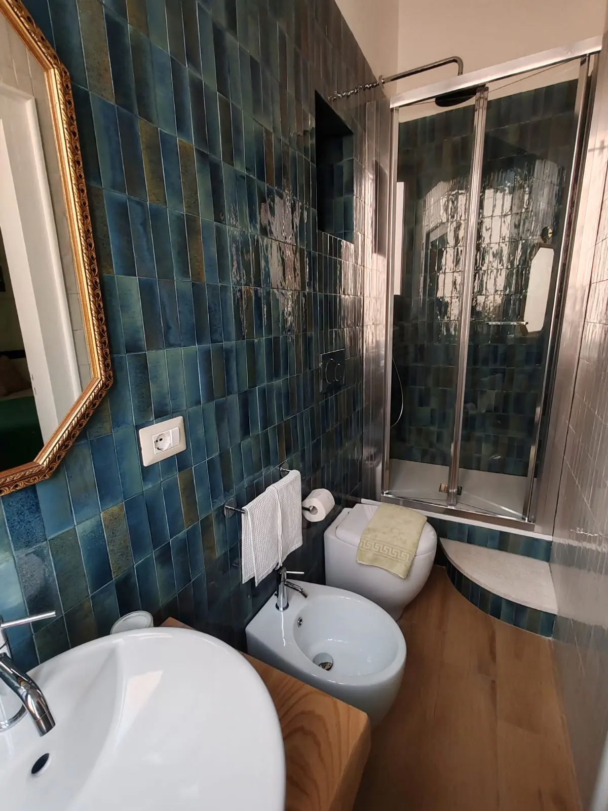 Il bagno con grande finestra, è dotato di WC e ampio box doccia ed è provvisto di set di cortesia, set di asciugamani, asciugacapelli.